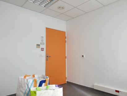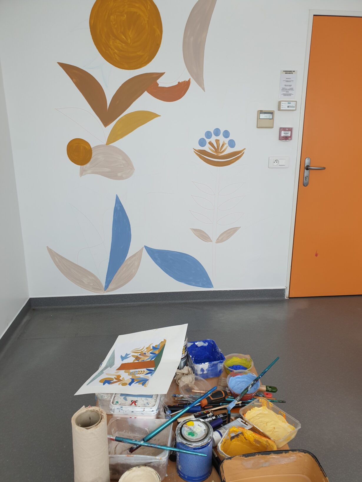 Il y a deux portes, toujours oranges : celle par laquelle tu arrives et l’entrée dans le service médical. Je me suis dit que j’allais me concentrer autour de la porte qui va vers le service, je voulais créer une invitation rassurante.