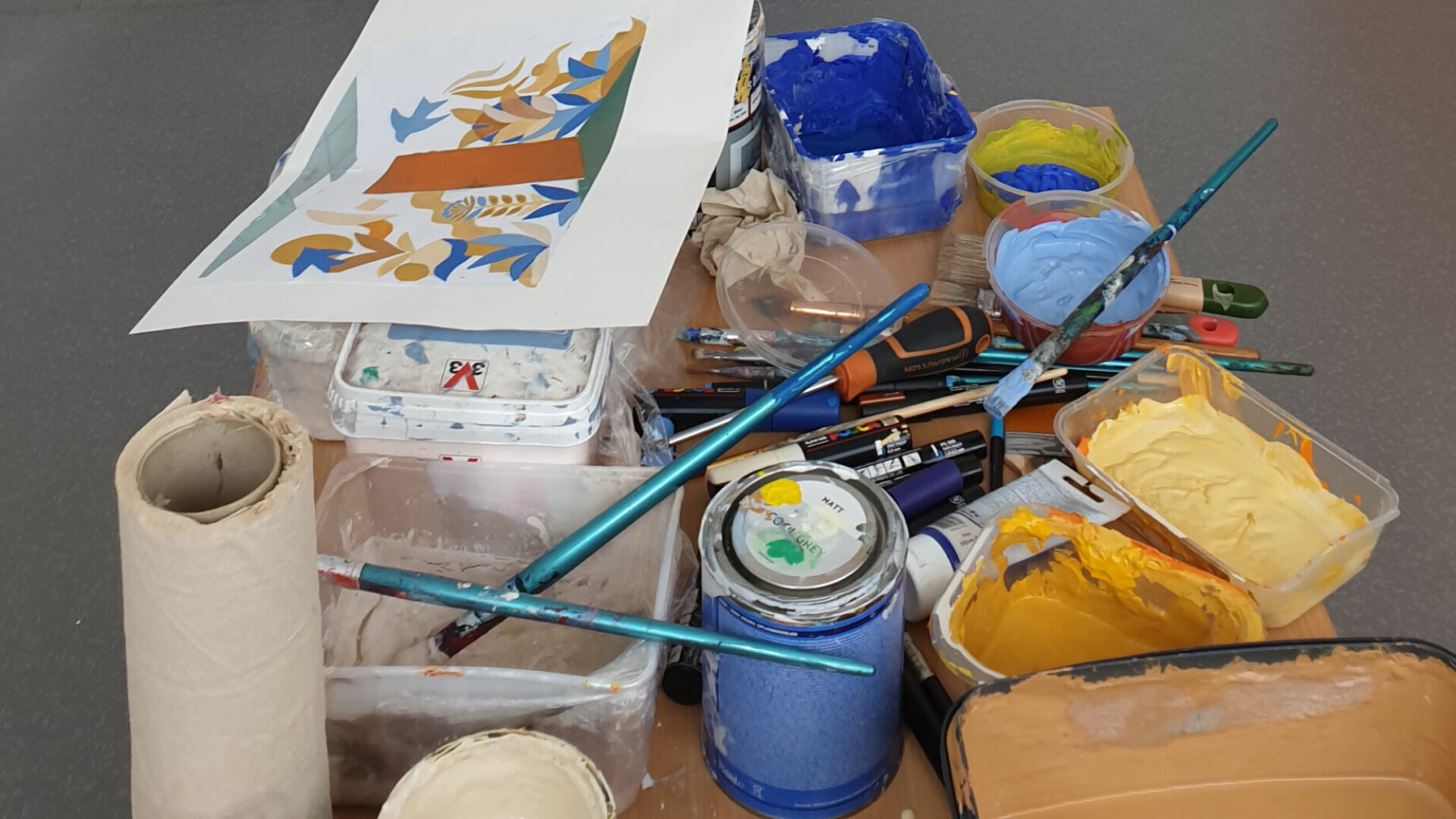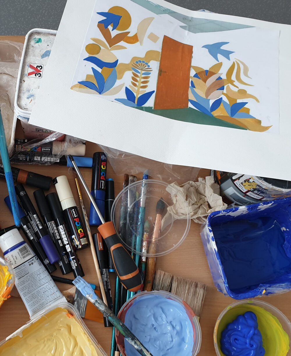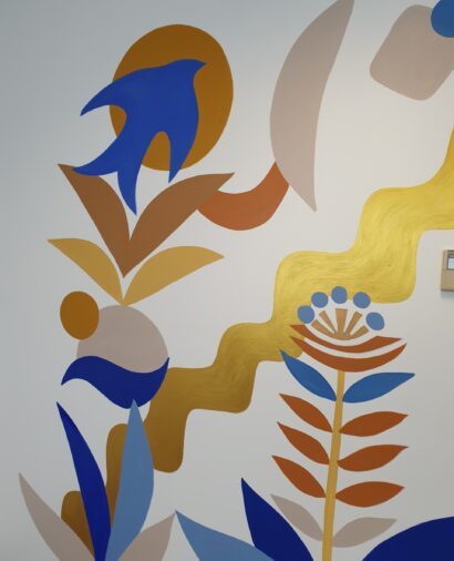 L’une de mes premières idées, c’est de peindre deux phénix, qui sont des oiseaux très symboliques qui renaissent de leur cendre, et j’ai ajouté des formes arrondies réconfortantes comme des fleurs et des plantes.