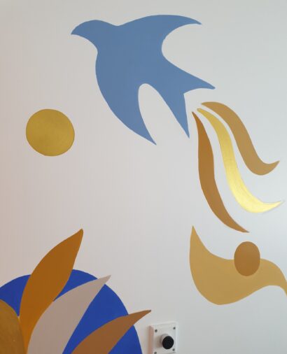 Les oiseaux sont en vol, contrairement à ceux posés de la salle à manger. C’est aussi un clin d’œil au peintre Matisse évidemment.