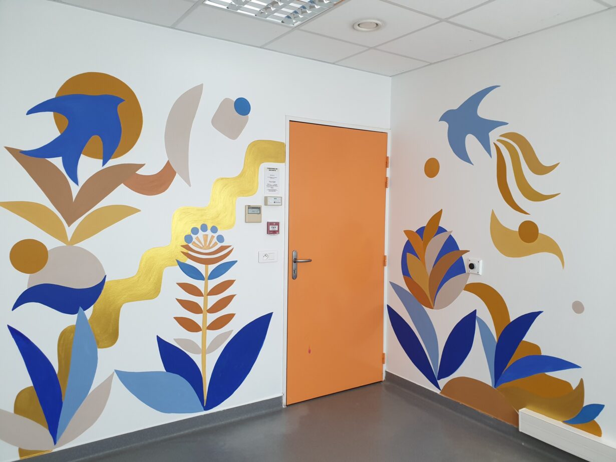 Amélie a terminé son travail au sein de l’hôpital de Quimper avec la fresque du bureau d’accueil. C’est la première pièce dans laquelle les patients entrent, et c’est aussi la dernière avant leur sortie de l’hôpital, celle de la guérison. L’artiste nous en dit plus comment elle a pensé et réalisé ses dessins.