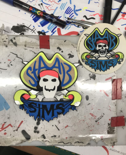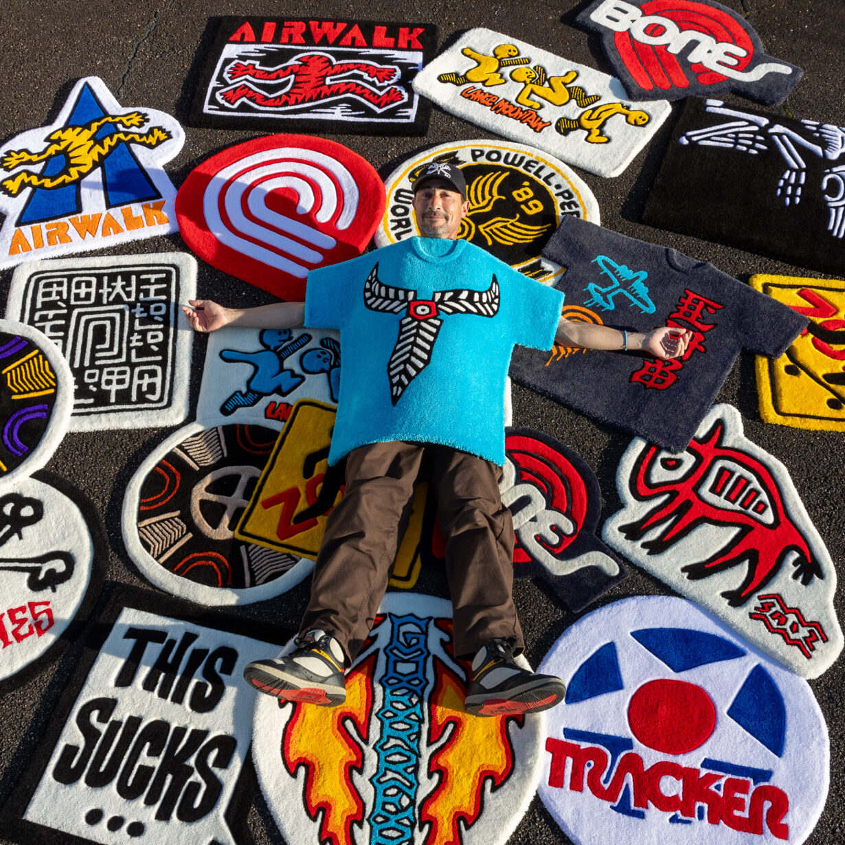 J’ai alors eu l’idée de reproduire en bois et en relief des stickers [autocollants] classiques des années 90. Dans ma lancée créative, je me suis mis à tufter [création de tapis en laine à l’aide d’une machine spécifique] toujours en reproduisant des designs liés au skate.