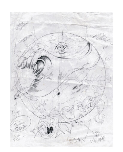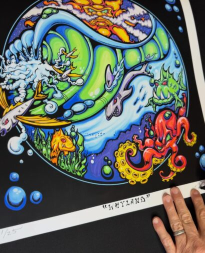 « L’une des premiĂšres idĂ©es Ă©tait une parodie de l’artiste Robert Wyland, qui peignait des scĂšnes marines, et souvent dans un cercle. On a pris mes vagues dĂ©lirantes, des poissons et le soleil, on a tout assemblĂ©, et on l’a appelĂ© WhyLand. Ces peintures Ă©taient aussi la premiĂšre fois que j’utilisais des POSCA sur toile, en transposant ce que j’avais pu faire sur des planches de surf. En regardant ce tableau, je me souviens l’avoir peint dans mon garage, et aujourd’hui je le fais vivre Ă  nouveau avec une sĂ©rie de tirages.