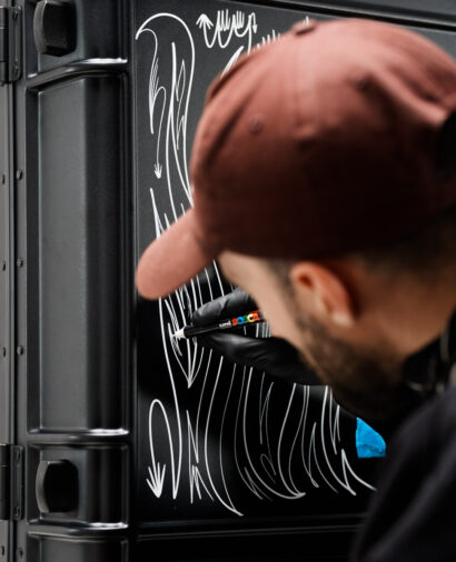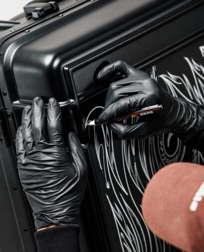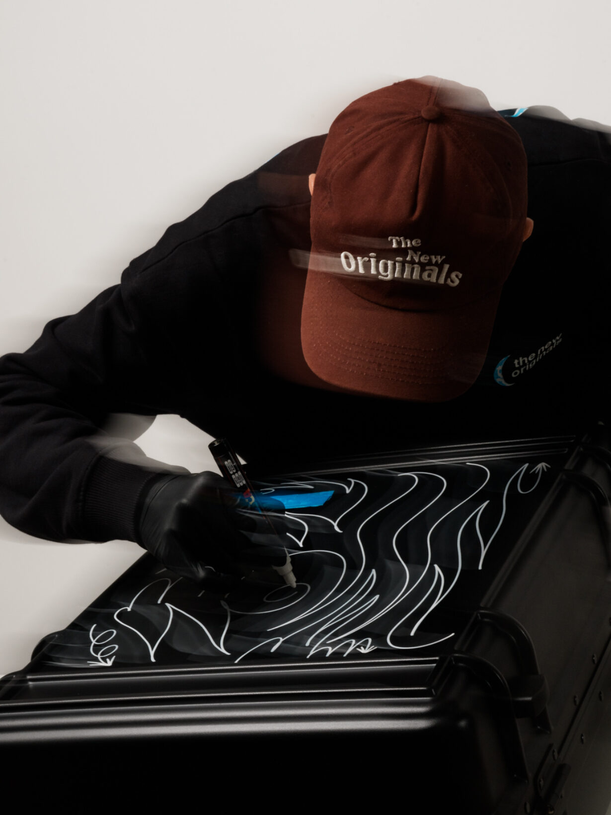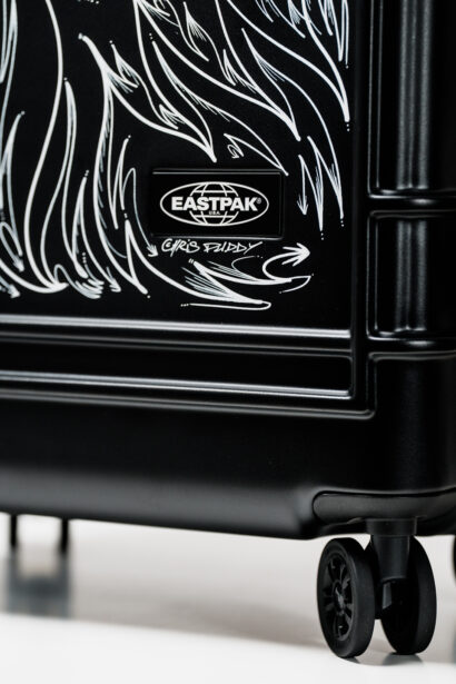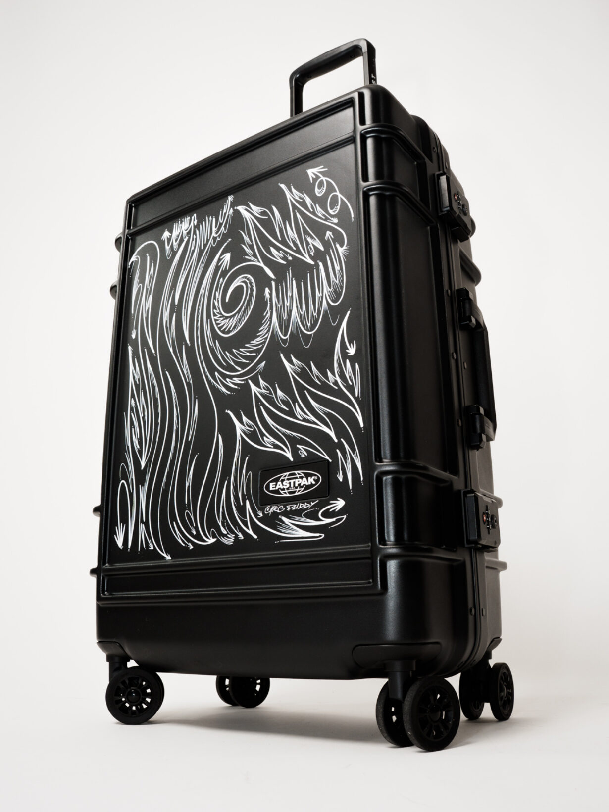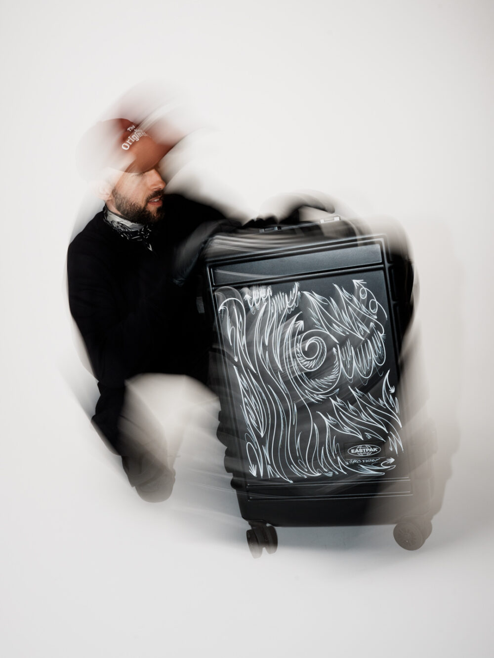 Comme son nom ne l’indique pas, Chris est français et travaille à Paris. Artiste aux volutes précises, il a une appétence pour le bleu et n’a pas de limite quant aux supports. Vestes, chaussures, tirages photo, toile ou planche de skateboard, on le retrouve aussi sur les murs ou un billet de 1 dollar. Cette fois, c’est une valise à roulettes de la marque Eastpak, pour barouder ou changer de vie quelques semaines.
