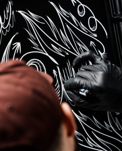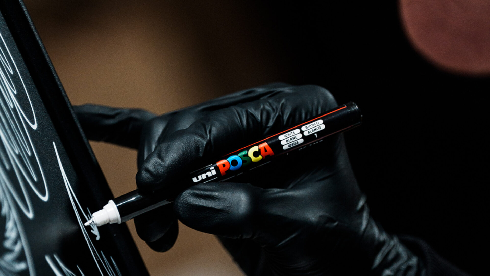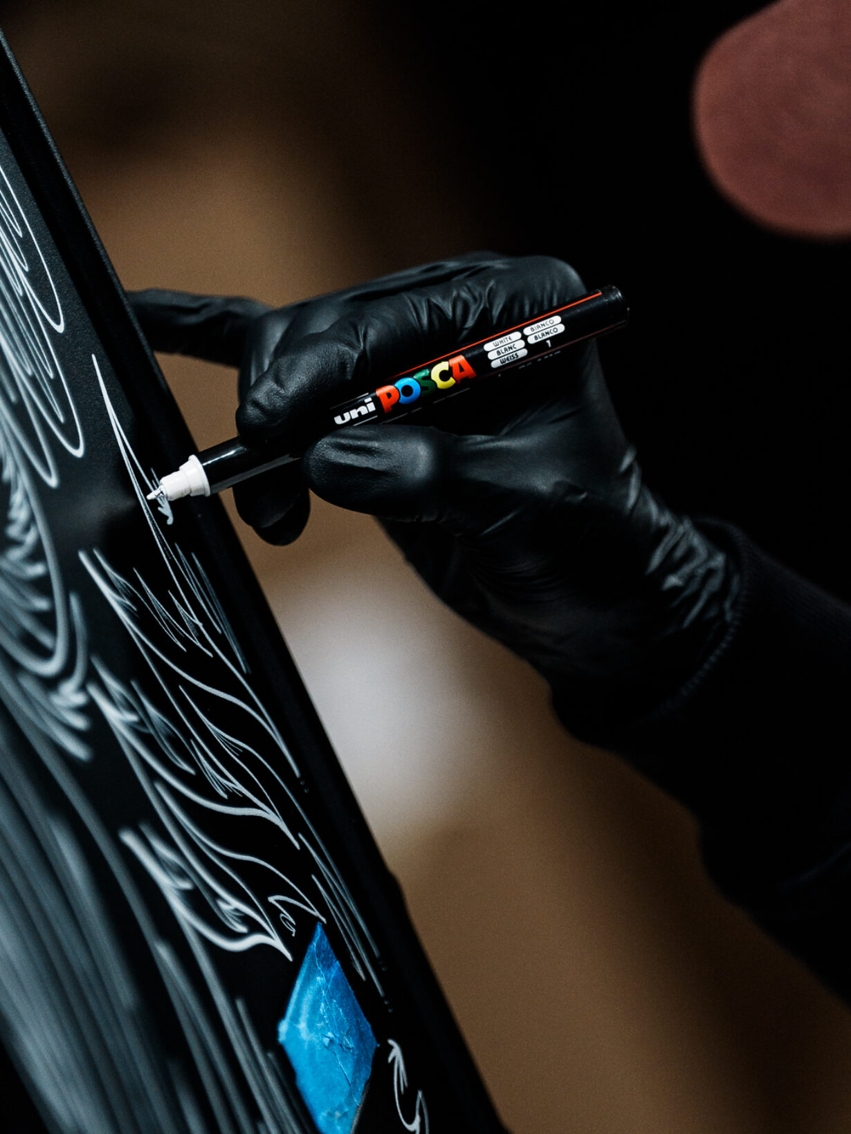 Pour cette custo, il a tout simplement utilisé des marqueurs blancs PC-3M et PC-5M pour les tracés francs, et un PC-1MR pour les détails et finitions.