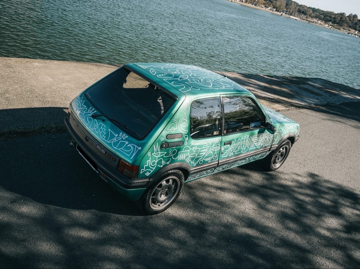 Voiture mythique qui aura été souvent un premier carrosse pour jeunes adultes autonomes, la Peugeot 205 est aujourd’hui prisée des collectionneurs. Enfin, surtout le modèle GTI, la version sport. Cette fois, Nils collabore avec Cobalt, un concessionnaire local. D’ailleurs, il semblerait que tous types de véhicules à quatre roues soient appréciés lorsque l’on découvre que les murs présentent une sacrée collection de skateboard, recouverts de bolides…