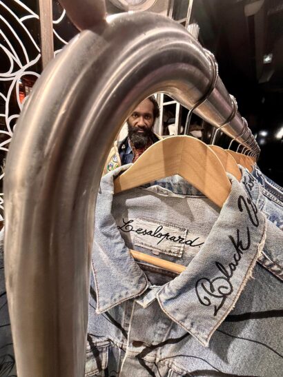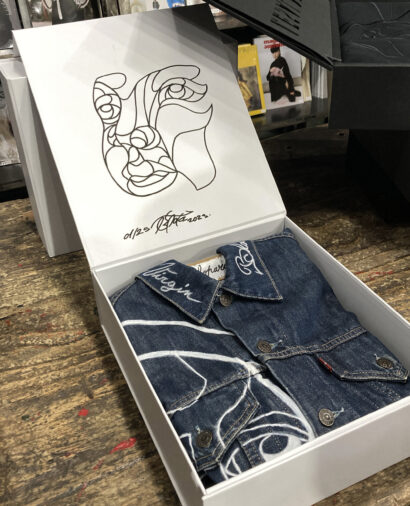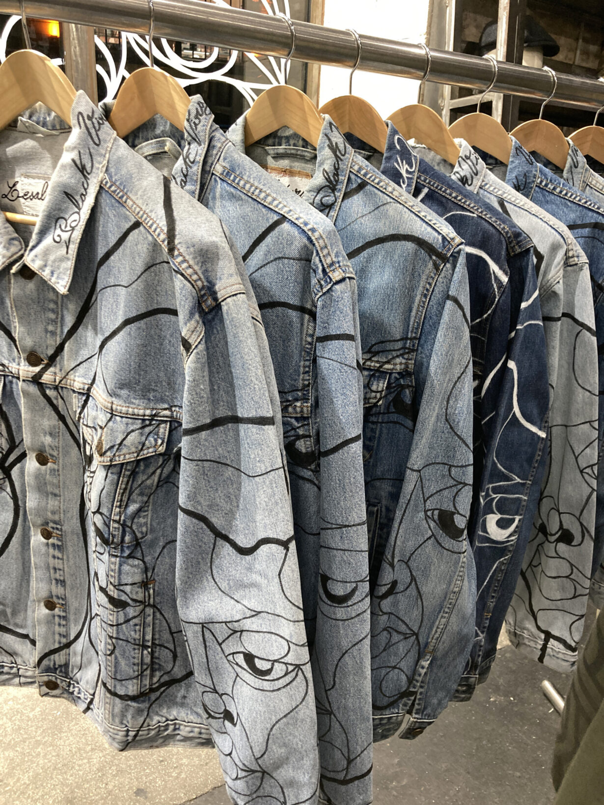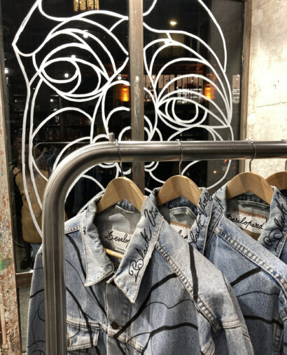 Vestes en jeans vintages et cuirs noirs « tatouées » en édition limitée, t-shirts et sweat-shirts soignés composent la collection. Le lancement avait lieu à Kiliwatch, le temple historique de la friperie parisienne.