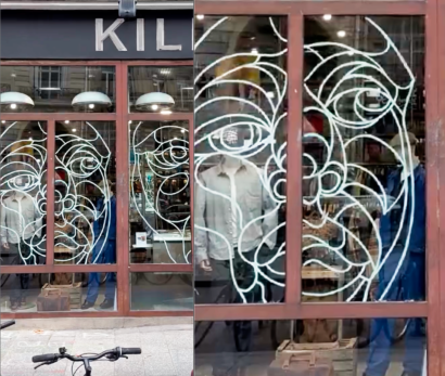 Pour marquer le coup, l’artiste a donc réalisé de grands portraits en liserés blancs avec des POSCA sur les grandes vitres qui donnent sur la rue, avec un bel effet de moucharabieh figuratif.