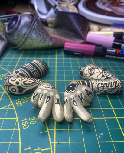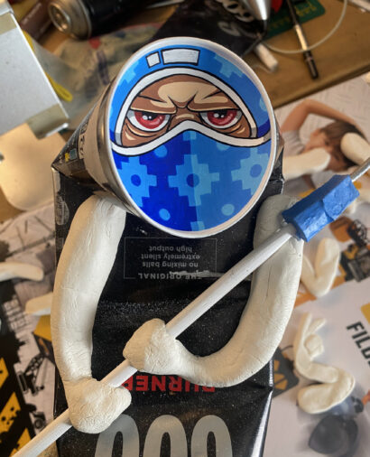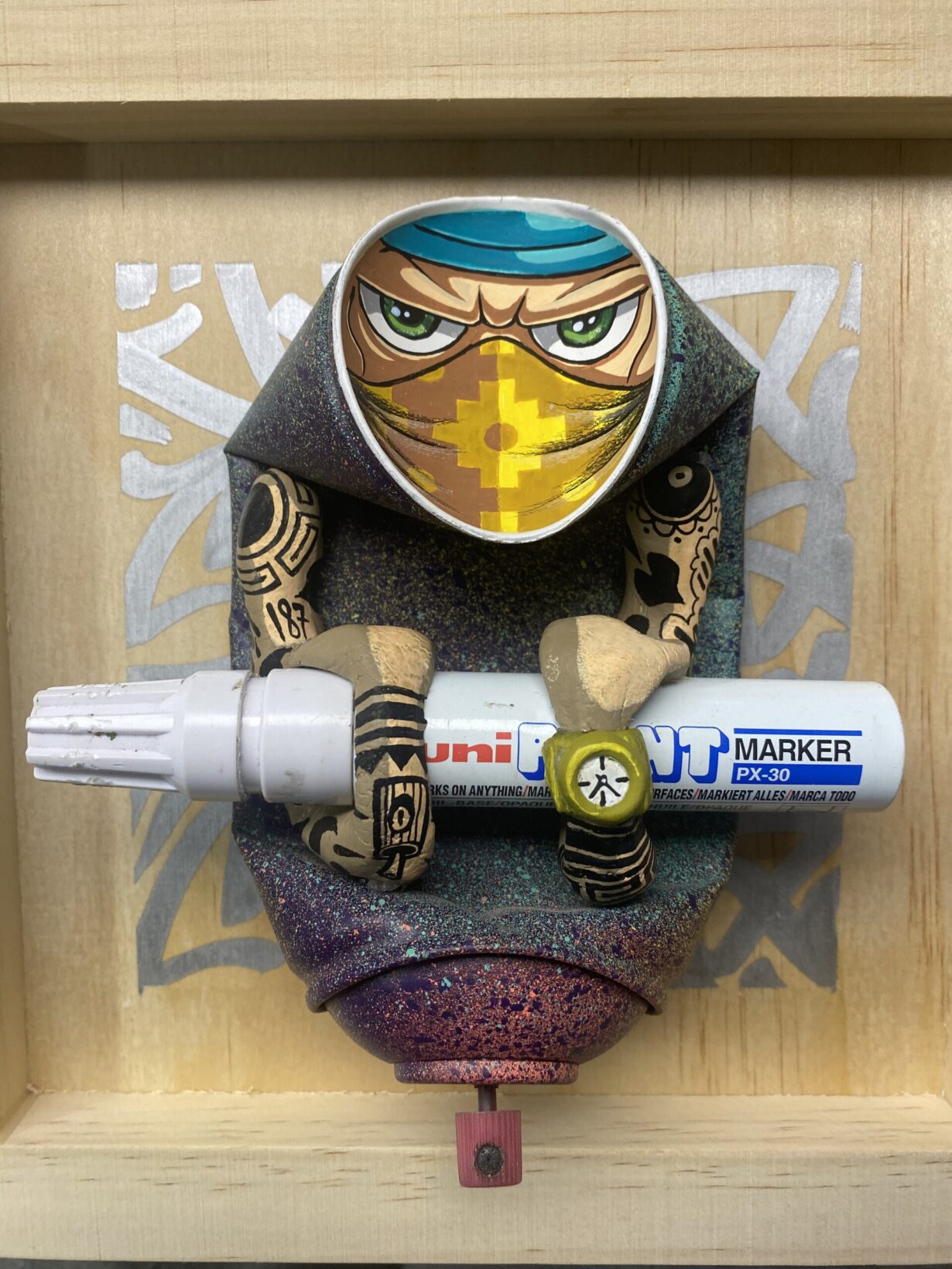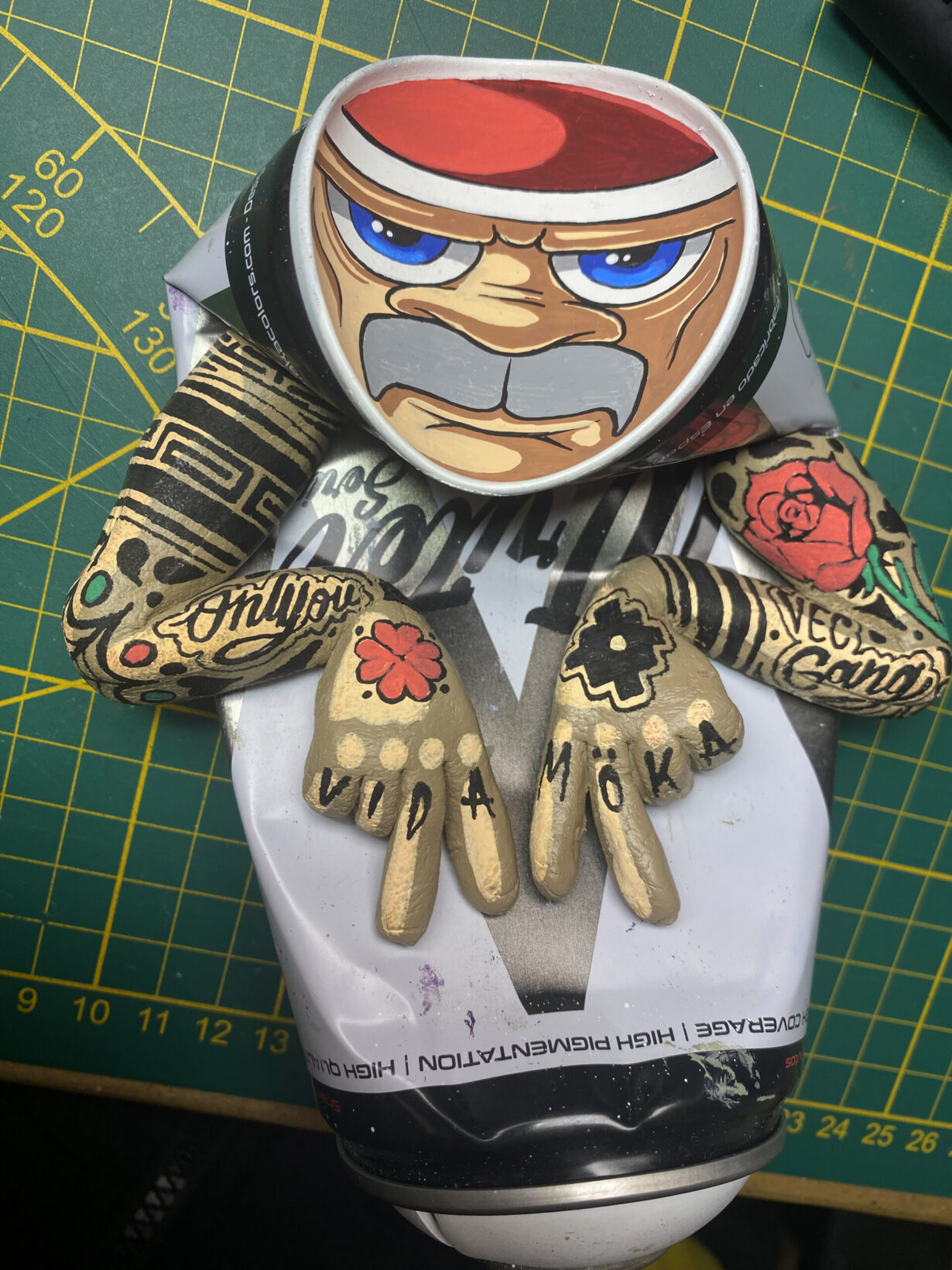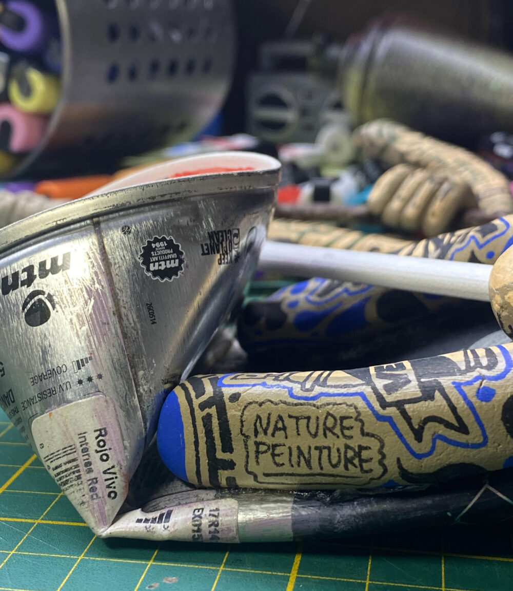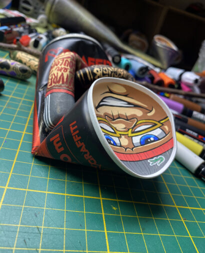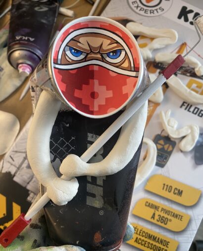 Car oui, il y a l’objet, mais aussi la démarche : « C’est en mode recyclage, je ramasse les vieilles bombes sur les terrains de graffs, je les nettoie un peu et je les customise. J’aime leurs formes écrasées, le fait qu’elles soient rouillées, je trouve ça beau. Et de donner une seconde vie à un outil qui a servi à créer une œuvre, c’est aussi ça qui me plait. »